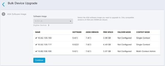 CDO provides a wizard that allows you to upgrade the ASA and ASDM images installed on an individual ASA or on multiple ASAs in single-context or multi-context mode. CDO maintains a database of ASA and ASDM images.