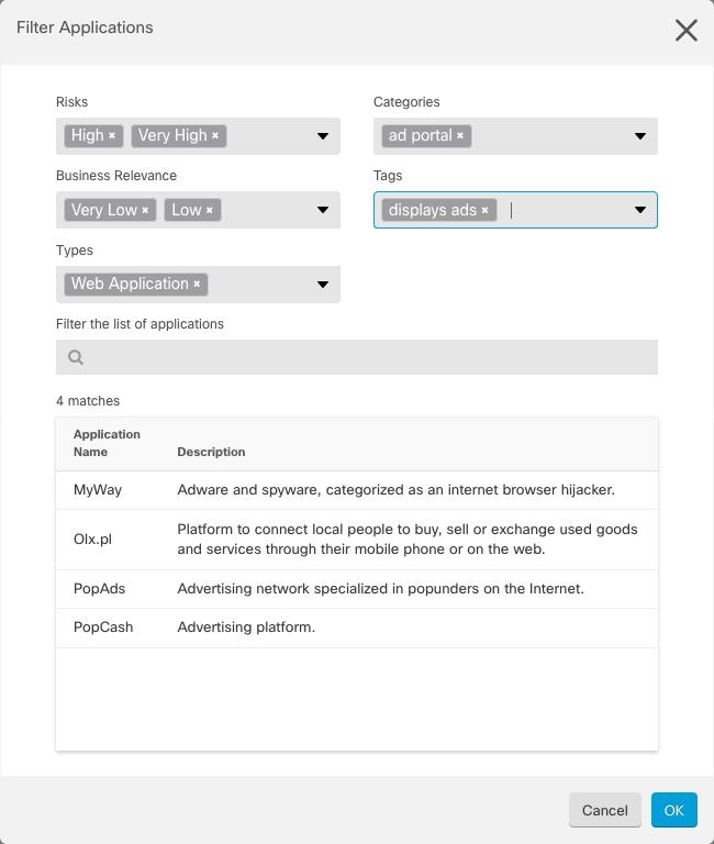 Step 4 | Click Add Filter and select the applications and filters to add to the object. The initial list shows applications in a continually scrolling list. Click Advanced Filter to see the filter options and to get an easier view for selecting applications. Click Add when you have made your selections. You can repeat the process to add additional applications or filters.