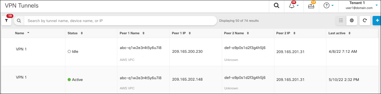 Step 2 | The VPN Tunnels page displays the connection status for all network tunnels managed by your CDO tenant. The connection status for the VPN tunnel can be active or idle. | ||