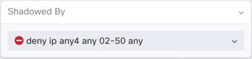 Step 2 | In the rule details pane, look for the Shadowed By area. In this example, the Shadowed By area for the rule in line 2 shows that it is being shadowed by the rule in line 1: