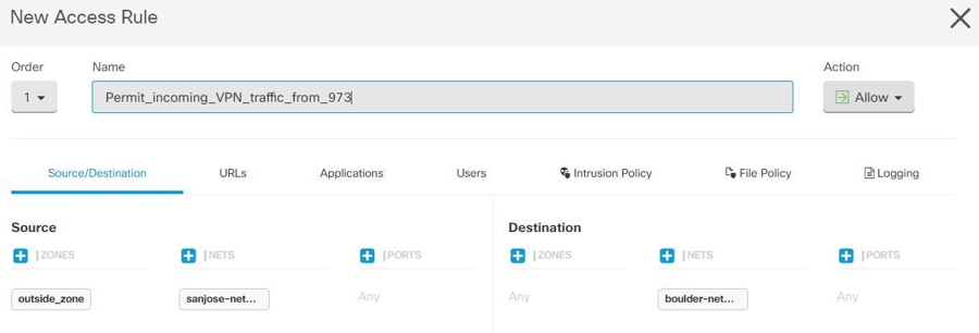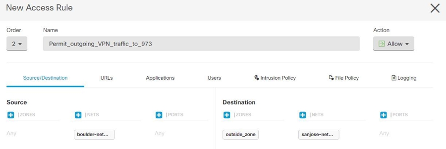 Step 1 | Configure AC policies: Configure AC policies for permitting bidirectional traffic between the protected networks behind both peers. These policies help the packets to traverse to the intended destination without being dropped.