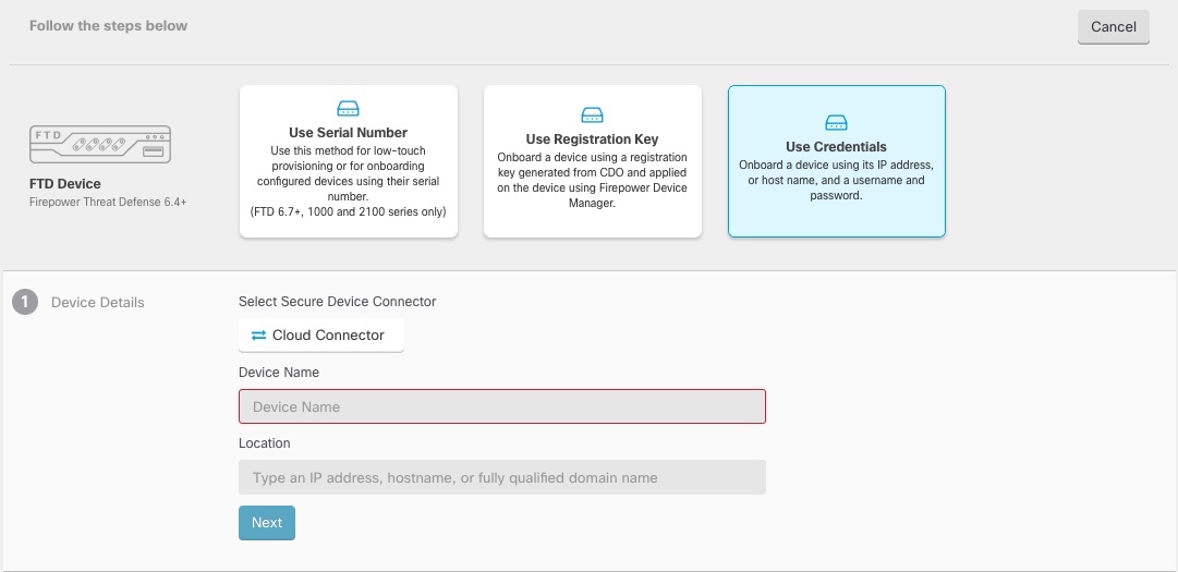 Use this procedure to onboard an FDM-managed device using only the device credentials and the device's Management IP address. This is the simplest method of onboarding an FDM-managed device. However, the recommended way of onboarding an FDM-managed device to CDO is by using a registration key.