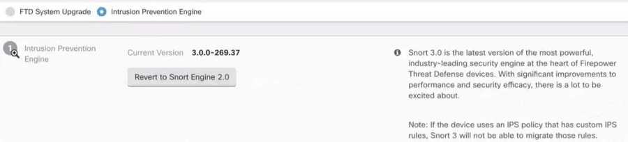 If you change the Snort version,the system will perform an automatic deployment to implement the change. Note that you can only revert individual devices from Snort 3.0 to version 2.