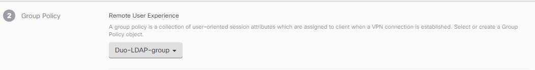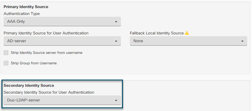 Step 4 | Create or edit the remote access VPN connection profile to use for Duo-LDAP secondary authentication. The following procedure just mentions the key changes to enable Duo-LDAP as the secondary authentication source and apply the AnyConnect client profile. For new connection profiles, you must configure the rest of the required fields. For this procedure, we assume you are editing an existing connection profile, and you simply must change these two settings. |