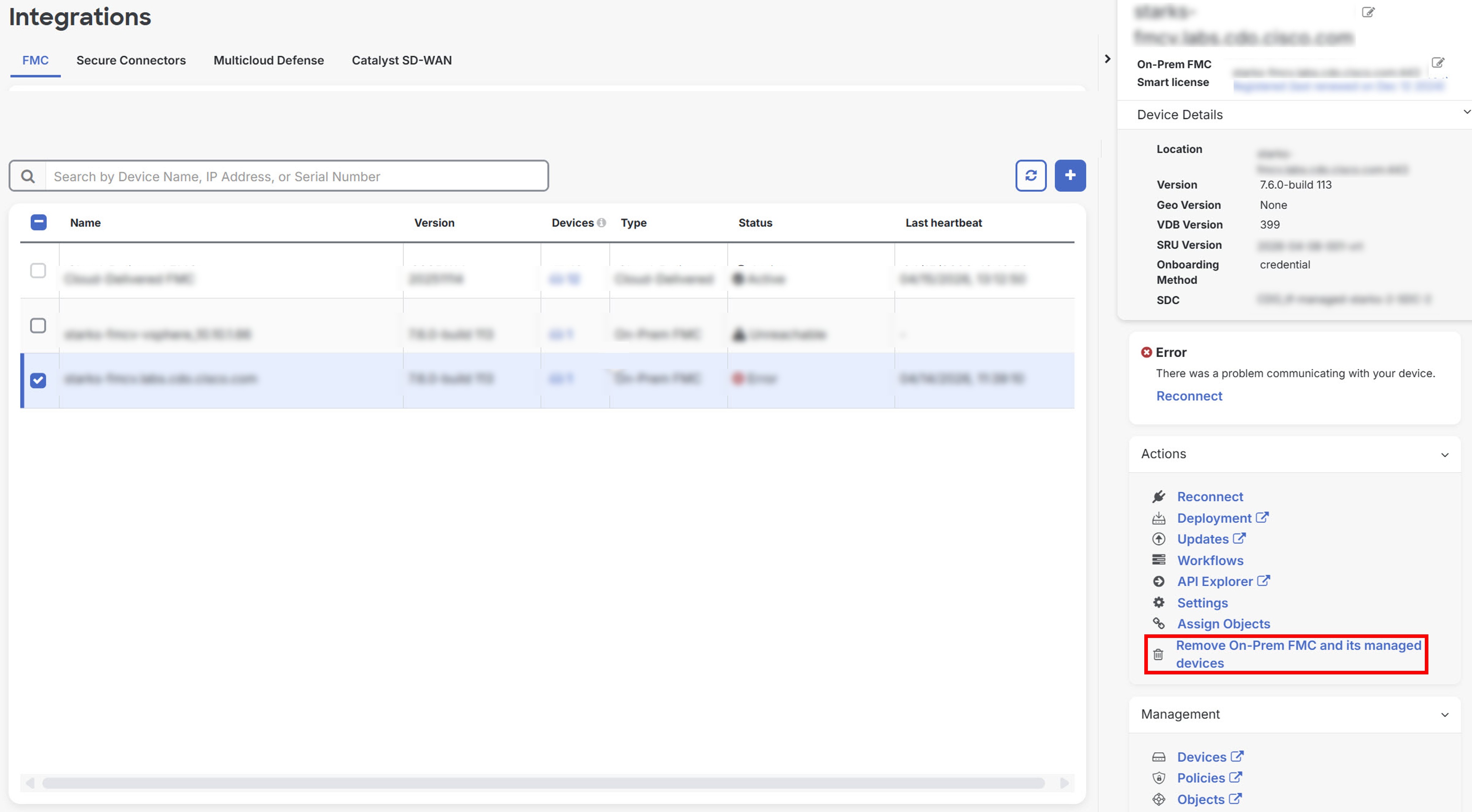 Step 3 | Choose the on-premises Firewall Management Center you want to remove. |