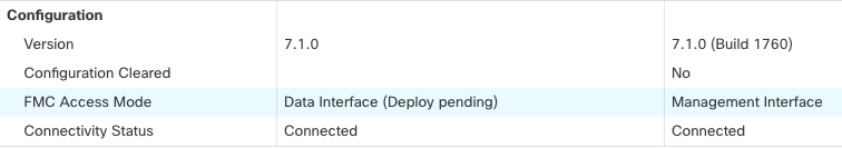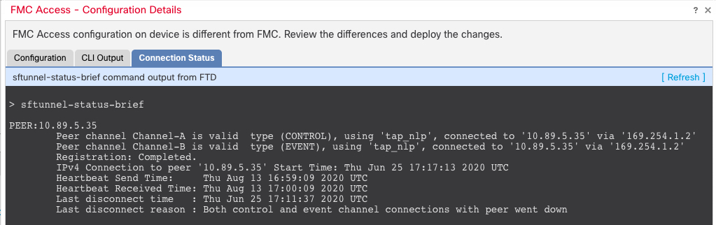 Step 11 | Ensure the management connection is reestablished. In the page, click FMC Access: Configuration and then click Connection Status. Alternatively, you can check at the Firewall Threat Defense CLI. Enter the sftunnel-status-brief command to view the management connection status. The following status shows a successful connection for a data interface, showing the internal "tap_nlp" interface.
