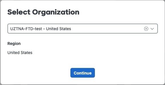 Step 4 | When prompted, select your organization from the drop-down list and click Continue. Select an organization that has both Secure Access and Secure Firewall micro applications configured. This figure shows an example.