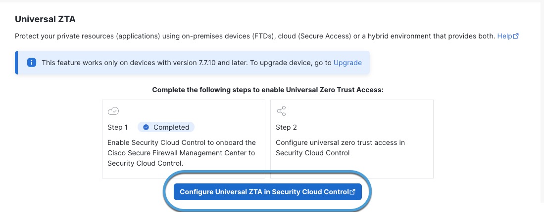Step 2 | Click Configure Universal ZTA in Security Cloud Control. This figure shows an example.