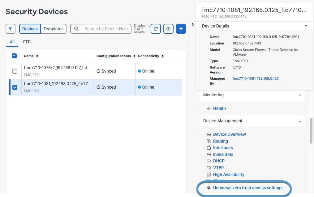 Universal ZTNA-enabled Firewall Threat Defense device is connected to Secure Access.