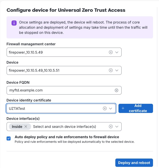 Step 10 | Click Deploy and Reboot. The device reboots to reallocate the system resources for universal ZTNA components.