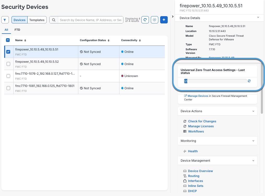 Step 11 | On the Security Devices page, select the check box next to the device to which you just deployed the Universal ZTNA configuration. The right pane displays the deployment status, as shown in the figure.